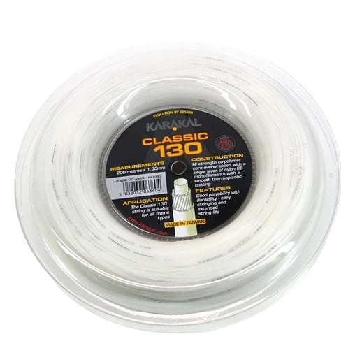 - der hochfeste 1,3-mm-Copolymerkern der Karakal Classic 130-Schlägersaite ist mit einer einzigen Nylonschicht mit 66 Monofilamenten und einer glatten thermoplastischen Beschichtung umwickelt