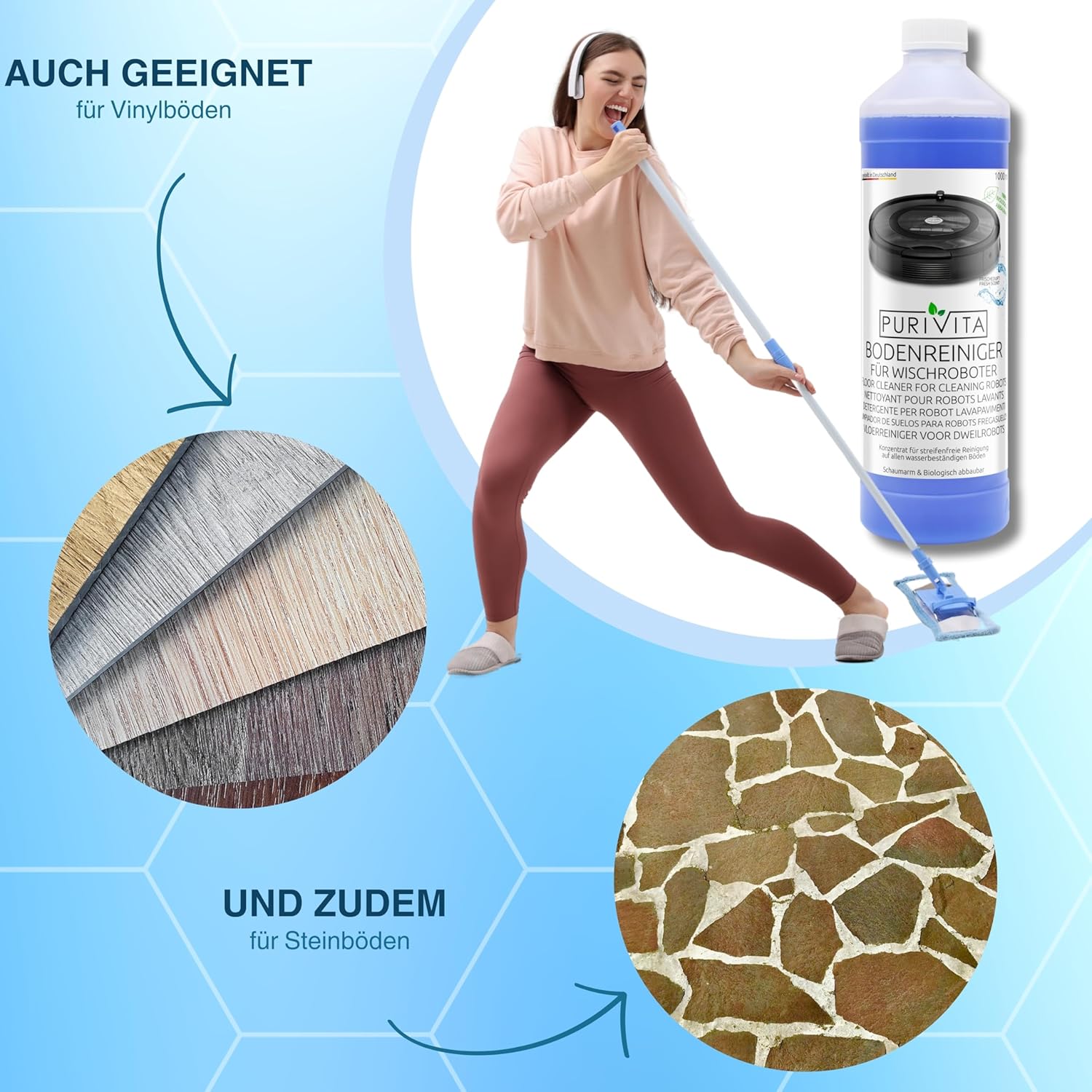 -Das kraftvolle Nasssauger-Reinigungsmittel ist für sämtliche wasserbeständigen Fußböden geeignet, wie z. B. Fliesen, Laminat, PVC, Vinyl, Holzböden. Es ist in handelsüblichen Wischrobotern einsetzbar und auch als Zusatz für Handwischer geeignet.