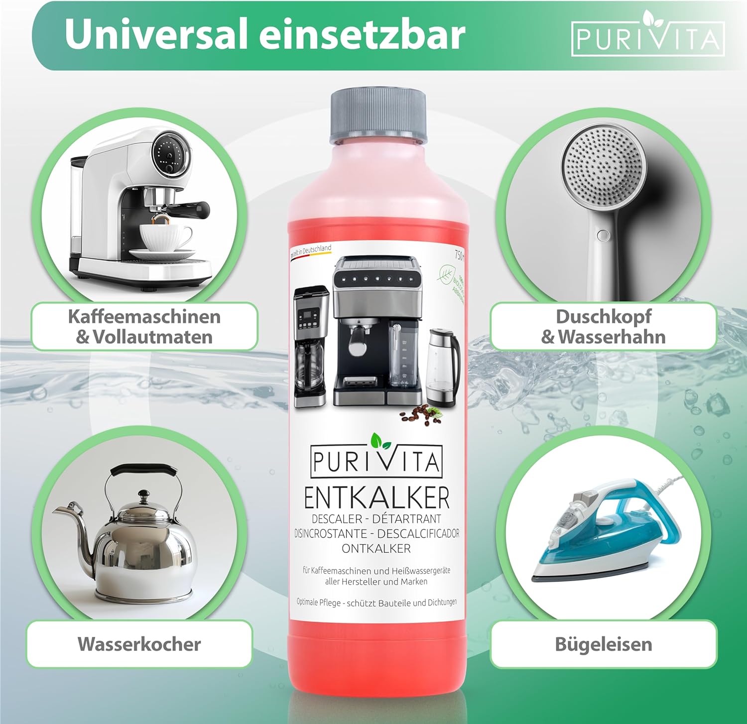 - Er schützt gegen Kalkablagerungen, die Leistung und Geschmack beeinträchtigen. Zudem ist die Entkalkungsflüssigkeit mit hoher Kalklösekraft noch für Bad, Sanitär, Urinstein oder Fliesen einsetzbar. Ü - Der Purivita Entkalker hat einen Farbindikator in der Flüssigkeit integriert. Der Farbindikator zeigt an, wann die Entkalkungswirkung erschöpft ist: die Farbe wechselt dann von rosa zu gelb!